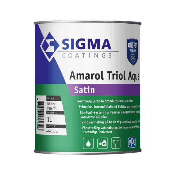 SIGMA Amarol Triol Aqua je premazni emajl na osnovi akrilata (ki se redči z vodo) s hitrim sušenjem, za notranjo in zunanjo uporabo.