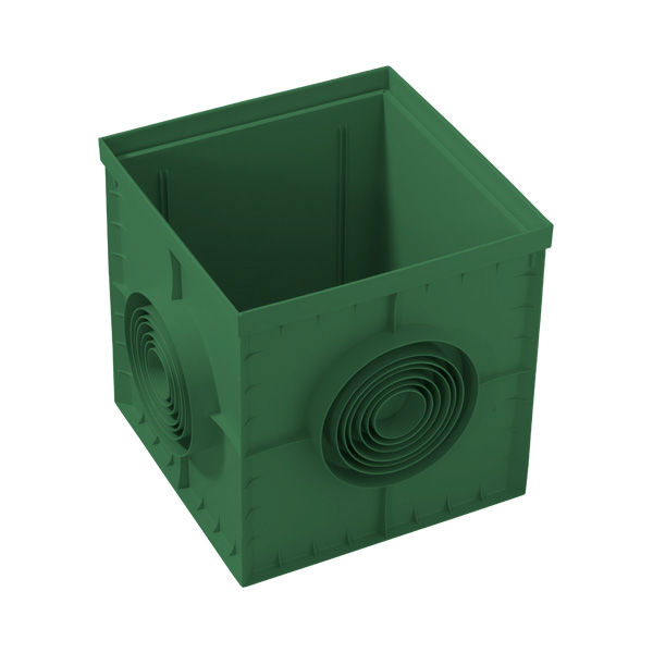 Kvadraten plastičen jašek iz polipropilena z označenimi odprtinami za cevi različnih dimenzij in razvod različnih napeljav na vseh 4 straneh. Visoko vremensko odporen. Na jašek se lahko namesti polni pokrov, rešetka ali sifon.