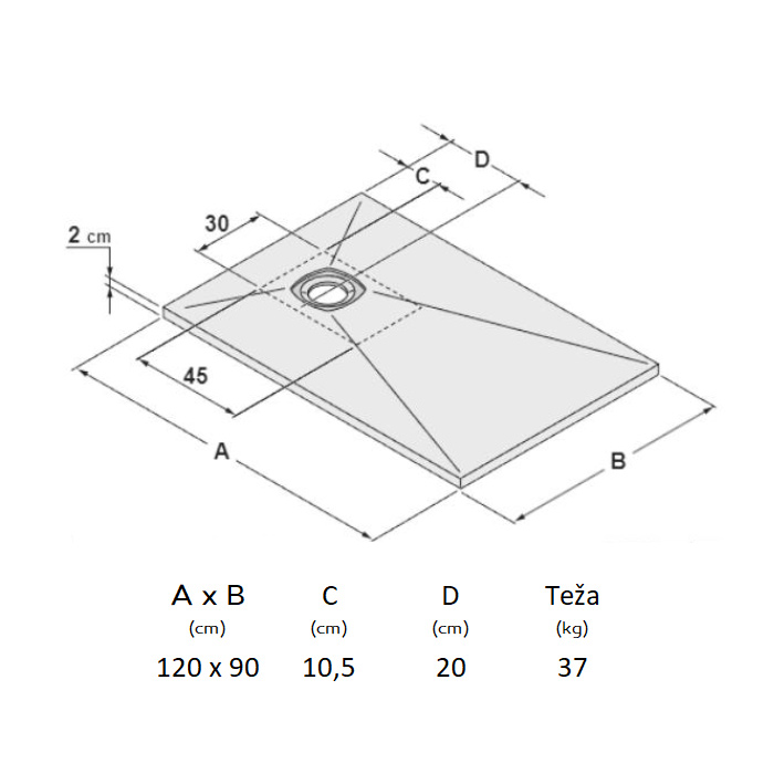 Vgradna pravokotna tuš kad Lotus, izdelana iz mineralnega kompozitnega materiala, prevlečenega z protibakterijskim Gelcoat premazom. Ploščo se lahko vgradi s polaganjem na tla, v nivo tal oz. talnih oblog ali delno poglobljeno v tla. Debelina kadi je le 2 cm, vendar ker gre za kad iz polne mase (t.i. full-body), to ne vpliva na njeno trdnost ali mehansko odpornost. Zaradi tega je kad lažja ter enostavnejša za vgradnjo.