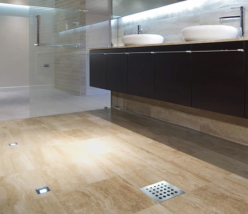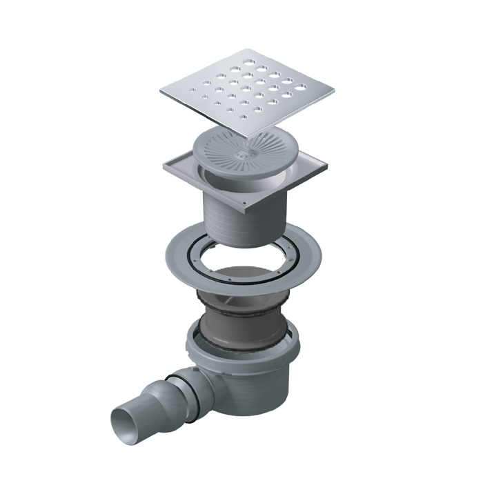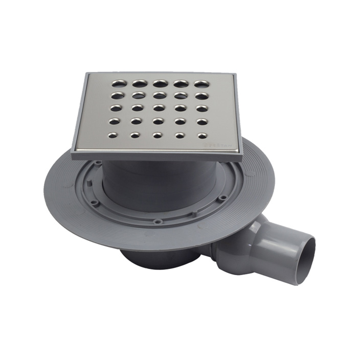 Točkovni talni kopalniški sifon s pokrivno rešetko z motivom kapljic, iz nerjavečega jekla, brez vidnega okvirja. S horizontalnim iztokom.