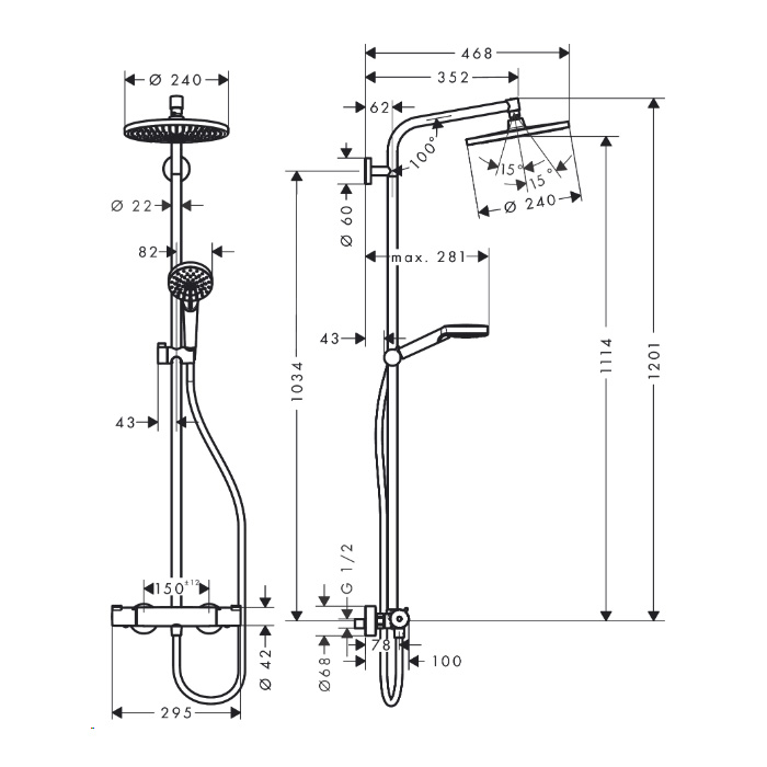 - Dimenzija nadglavne prhe: Ø 240 mm, s krogličnim zglobom, gibljiva