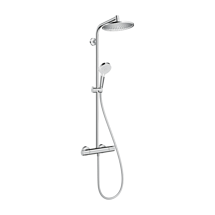 Sestav za prho za stensko montažo z okroglo nadglavno prho, armaturo s termostatom, ročno prho z dvema načinoma pršenja in tehnologijo Ecosmart, ki z omejevalnikom pretoka porabi do 60 % manj vode, ročico za preklapljanje med obema prhama in stensko konzolo.