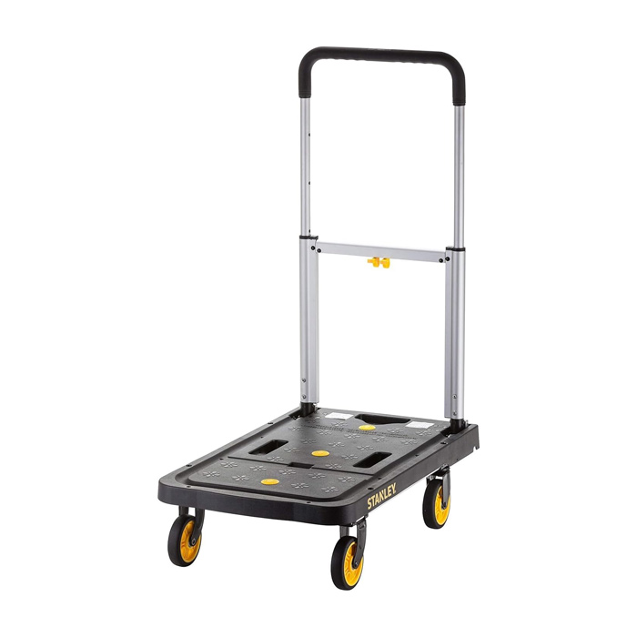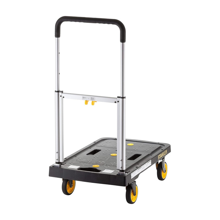4-kolesni voziček Stanley PC517 s protizdrsno platformo in višinsko nastavljIvim ročajem za varno ter zanesljivo prevažanje bremen. Robustne zasnove, izdelan iz alumija, s platformo iz polipropilena in kolesci s krogličnimi ležaji, oblečenimi s termoplastično gumo TPR. Primeren tako za profesionalno kot domačo uporabo.