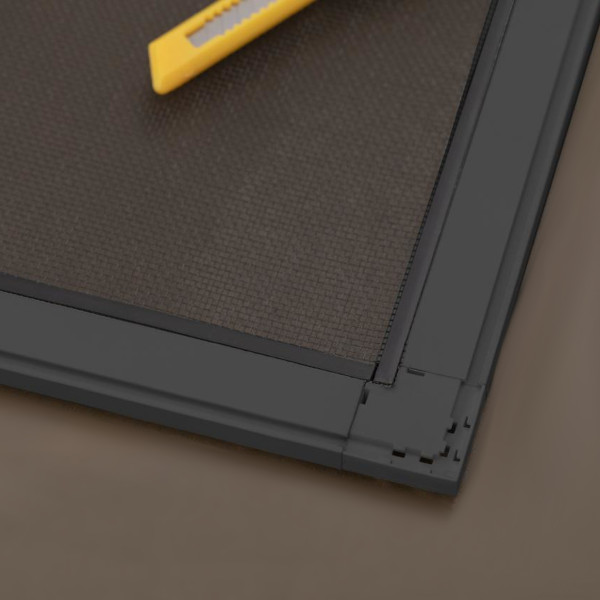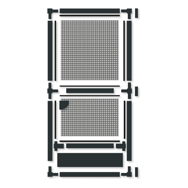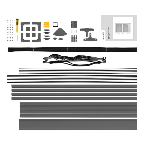 Komplet vključuje zaščitno mrežo, aluminijast okvir, magnetni sistem, vogalne spojnike, prečke, udarno ploščo, ročaja, ščetka za tesnjenje, tečaja, rezalni nož in kovinski sveder (2 mm).