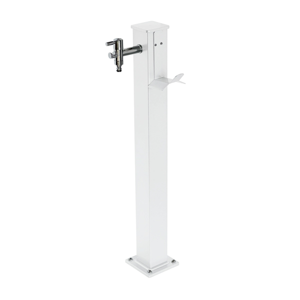 Samostoječ vrtni vodni stolp s kromirano pipo iz medenine, kvadratnim podstavkom za montažo in držalom za zalivalno cev. Drog je izdelan iz aluminija in prašno barvan s termoreaktivno poliestrsko barvo. Pipa je opremljena s hitrim priključkom za enostaven priklop cevi. V kompletu z vsemi potrebnimi dodatki za priključitev na vodovod in pritrditev na tla.