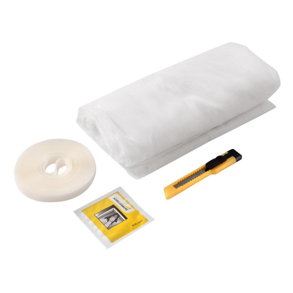 Komplet vključuje zaščitno mrežo, samolepilni pritrdilni trak, rezalni nož in čistilno krpico.