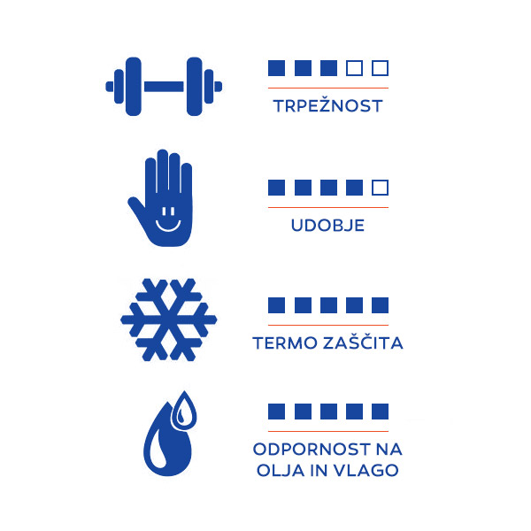 Robustne zimske rokavice, ki ostanejo zanesljive tudi v zelo hladnem okolju. Prevlečene so z dvojnim lateks premazom s peskasto površino, ki odbija vodo in olje, medtem ko dvojna podloga ohranja roke dodatno tople med opravili v nizkih temperaturah. Nudijo zanesljivo zaščito pred umazanijo, mrazom in mehanskimi nevarnostmi, zato so idealne za kmetijska in gozdarska dela, montažna in gradbena dela ter razna popravila. Zagotavljajo varen oprijem tudi na gladkih predmetih, poleg tega pa navdušujejo s popolnim prileganjem.