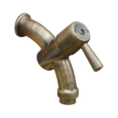 Polkrožno upognjena pipa za vrtni umivalnik ali korito, izdelana iz medenine, s križnim ventilom za odpiranje vode.