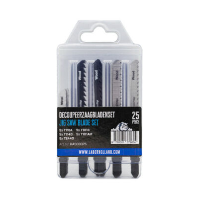 Vbodni žagini listi Labor so idealni za žaganje različnih kovin in lesa. Rezila žag za kovine, primerna za rezanje jekla debeline 1-3 mm, so izdelana iz hitroreznega jekla HSS in omogočajo čist in natančen rez. Rezila žag za mehek les so izdelana iz močnega ogljikovega jekla HCS, ki je primren tudi za žaganje krivin oz. krivulj. Rezila žag za trdi les so izdelana iz bimetalnega jekla BiM (list iz orodnega jekla, zobje iz HSS jekla) in so odlični za rezanje vezanega lesa ali laminata.Set vsebuje:5x list za vbodno žago HSS, za rezanje kovinSkupna dolžina: 76 mmDelovna dolžina: 50 mmUporaba: kovinaMaterial lista: hitrorezno jeklo (HSS)Št. zob na palec: 215x list za vbodno žago HCS, za rezanje lesaSkupna dolžina: 100 mmDelovna dolžina: 75 mmUporaba: mehki lesMaterial lista: ogljikovo jeklo (HCS)Št. zob na palec: 65x list za vbodno žago HCS, za hitro rezanje lesaSkupna dolžina: 100 mmDelovna dolžina: 75 mmUporaba: mehki lesMaterial lista: ogljikovo jeklo (HCS)Št. zob na palec: 65x list za vbodno žago HCS, za rezanje lesaSkupna dolžina: 100 mmDelovna dolžina: 75 mmUporaba: mehki lesMaterial lista: ogljikovo jeklo (HCS)Št. zob na palec: 105x list za vbodno žago BiM, za rezanje lesaSkupna dolžina: 100 mmDelovna dolžina: 75 mmUporaba: trdi lesMaterial lista: bimetalno jeklo (BiM)Št. zob na palec: 15