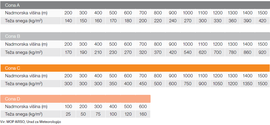 Kot je v spodnji tabeli razvidno, so lahko obremenitve zaradi snega v Sloveniji precejšnje, zaradi tega je preprečevanje zdrsa snega s strehe nujno in obvezno. V shemi desno lahko odčitamo, v kateri coni se nahajamo in na podlagi nadmorske višine v preglednici 1 karakteristično obremenitev snega na tlorisni kvadratni meter strešine.