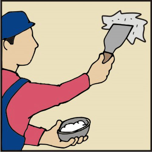 3. Po navodilih proizvajalca zmešajte ustrezno količino gradbenega mavca. Z lopatico, ki jo držimo pod kotom, nanesemo mavec na steno in ga vtisnemo v poškodovano mesto. Če je poškodovano mesto globoko, je bolje mavec nanesti v več tanjših plasteh. Pred nanosom naslednje plasti se mora predhodna plast posušiti.